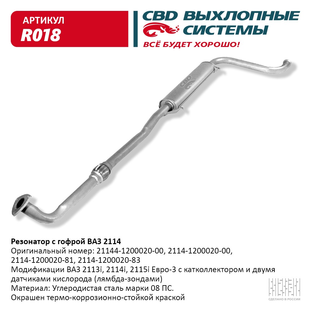 Технические характиристики: Глушитель ВАЗ-2114 дополнительный (дв.1.6) с гофрой 21144-1200020 ООО "CBD" г.Санкт-Петербург /арт.R018/